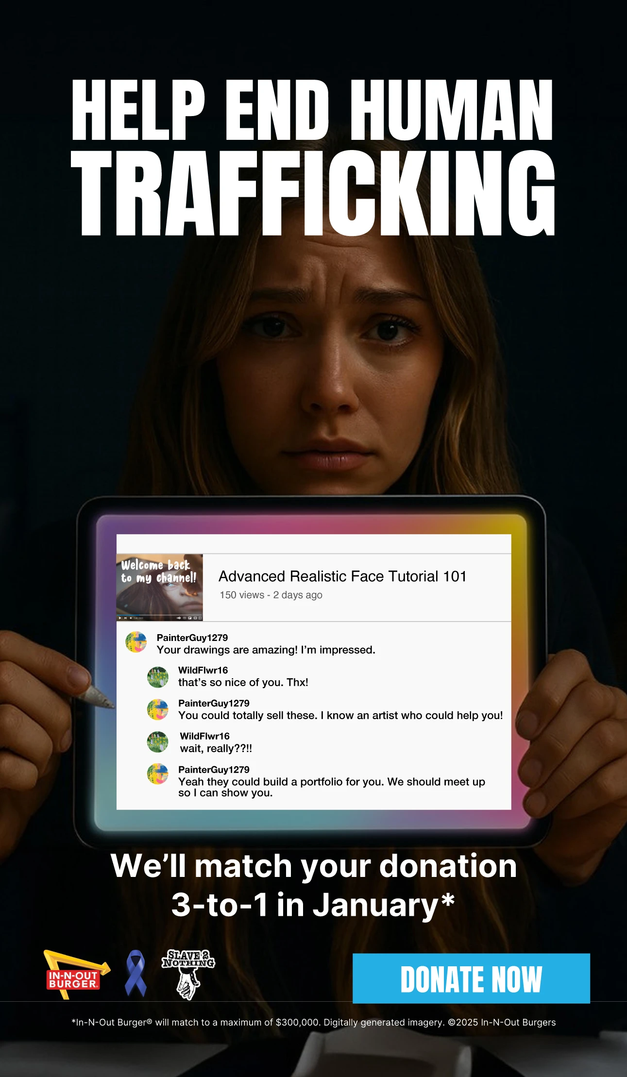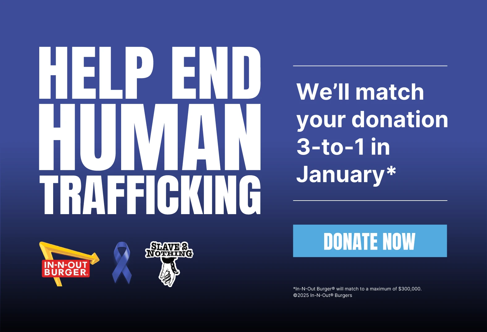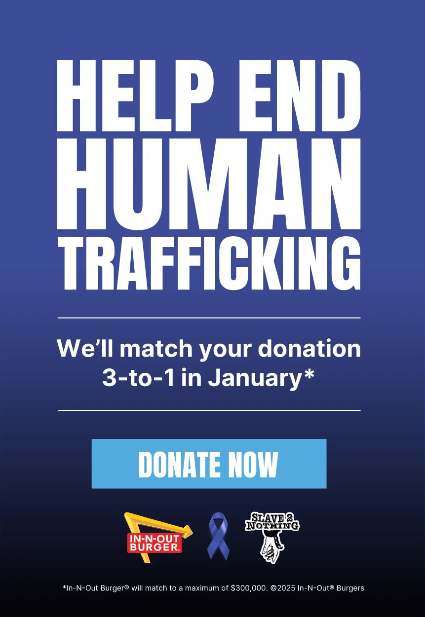 In-N-Out Burger covers all costs associated with the Slave 2 Nothing Foundation, ensuring that 100% of every dollar raised goes to organizations that assist individuals and families to gain freedom and healing from substance abuse and human trafficking.